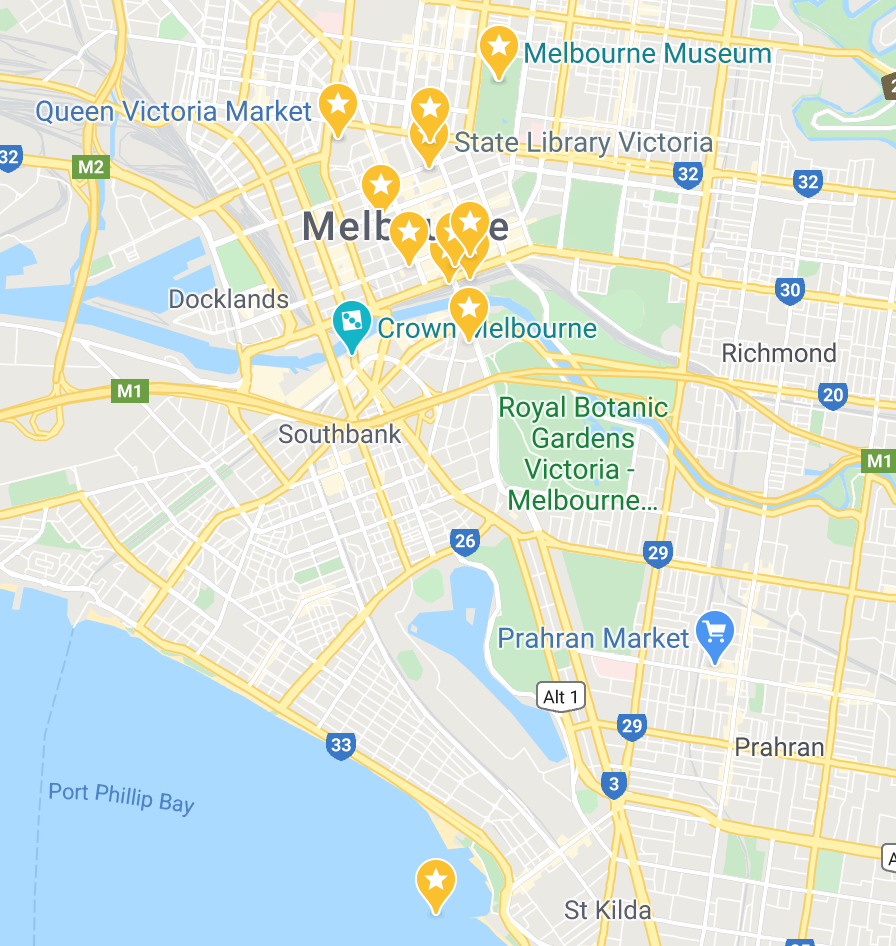 During our time in Melbourne, we visited the spots marked by yellow stars on the map. Most of them were within walking distance of our AirBnB, or within the free tram zone downtown, but we did have to take a taxi to St. Kilda Pier on our second day in the city.